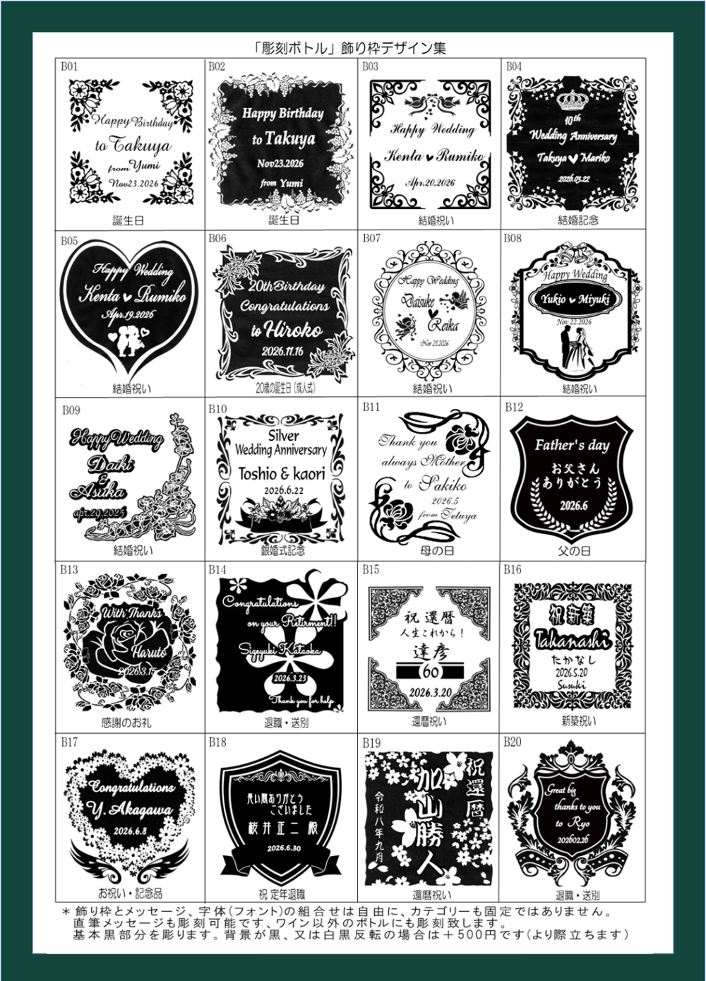 彫刻ボトルのパターン(上記Ⅰ~Ⅲのどれか)が決まりましたら下記の飾り枠デザイン集、メッセージ集、フォント集からそれぞれ記号を選び、彫るお名前や記念日などとそれぞれのパターンの≪ご注文フォームへの入力例≫を参考に「ご注文フォーム」へ入力してください。ご注文フォームへは、