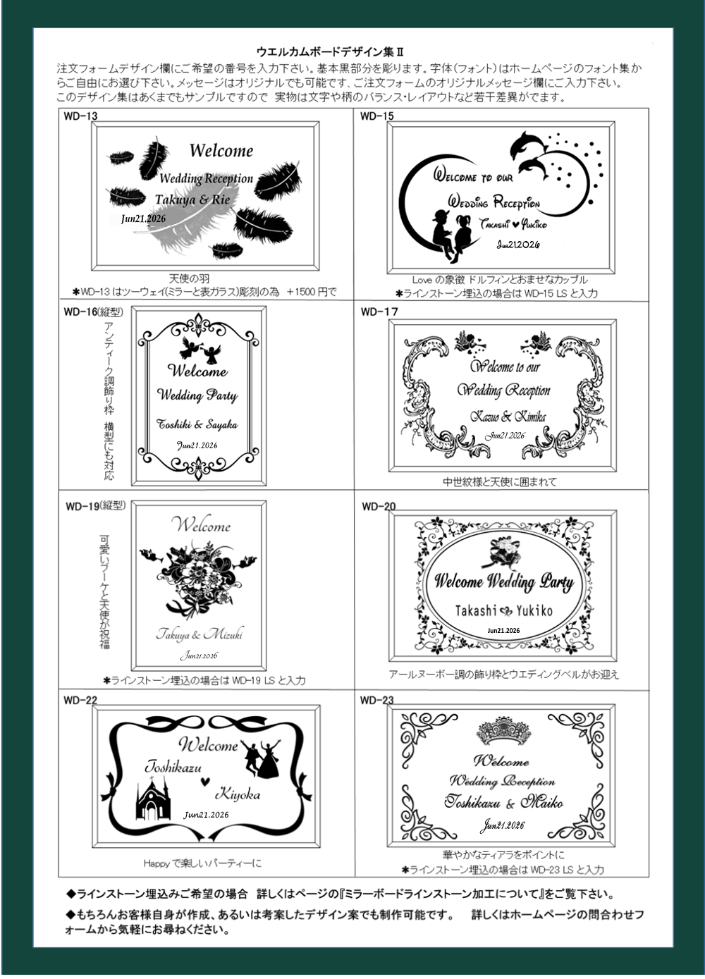 ✱ラインストーン対応のデザインは番号の語尾に LS を付ける旨説明書きあります(例:WD-1 LS)。ラインストーン無しの場合は WD-1で。